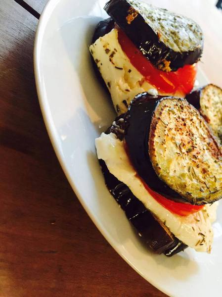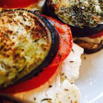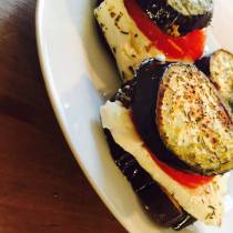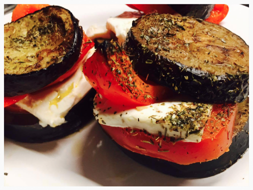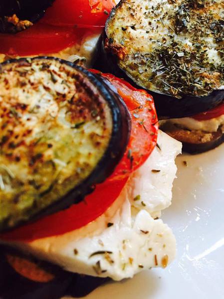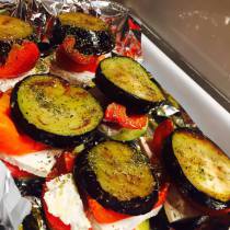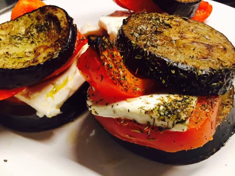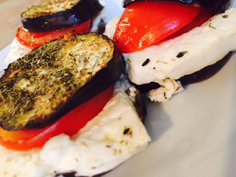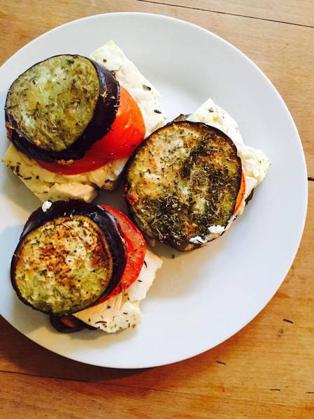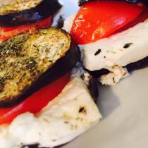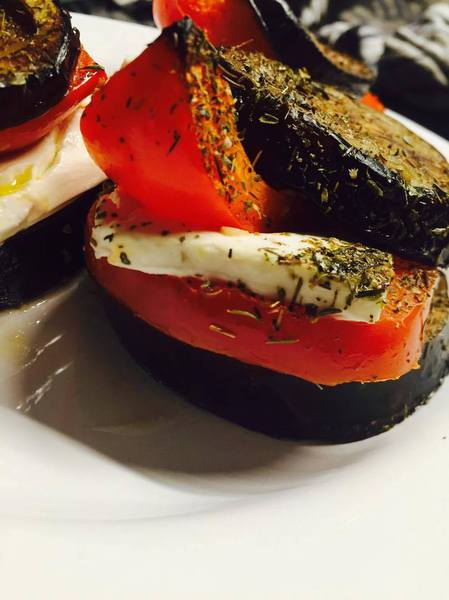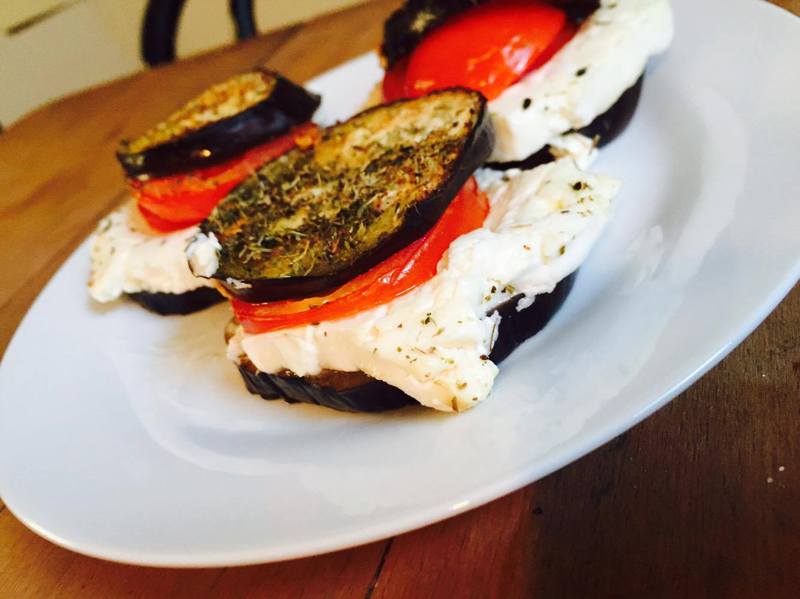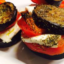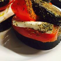 - Schneidet die Auberginen in 12 ca. 1cm dicke Scheiben. Den Schafskäse halbiert ihr und drittelt die Hälften dann in 6 breite dünne Scheiben. Dementsprechend benötigt ihr auch 6 Tomaten- und die