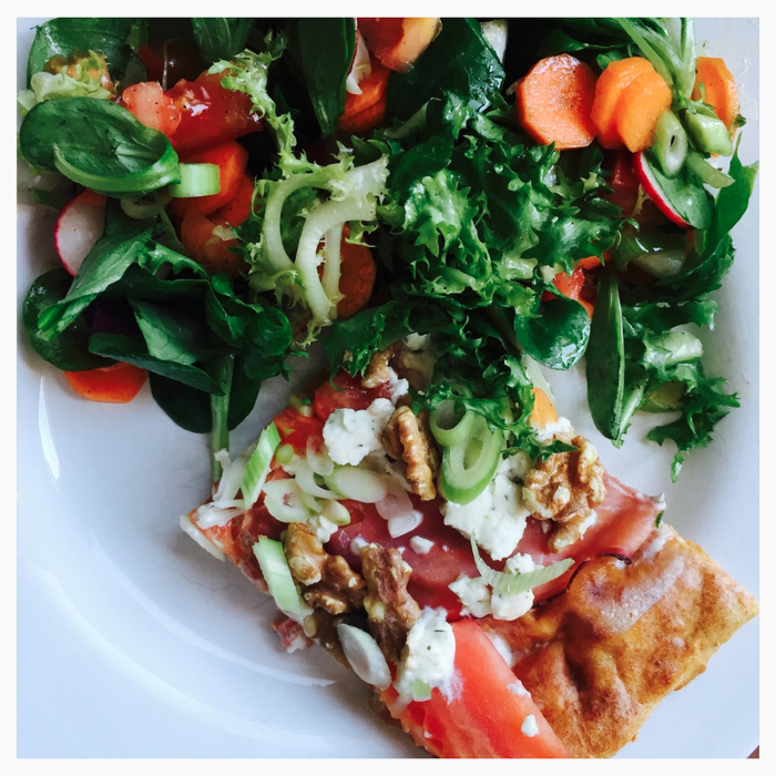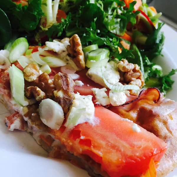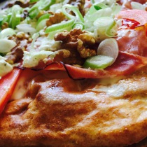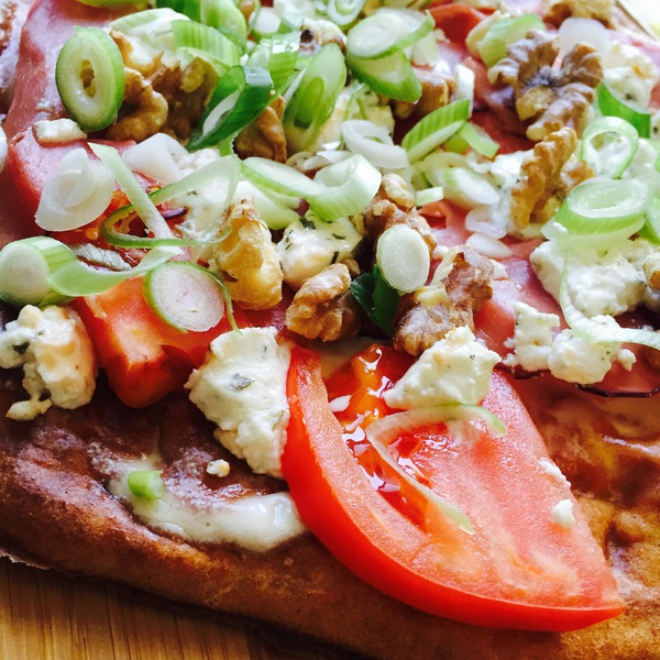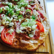 Teig rausholen und mit etwas Creme Fraiche bestreichen. Tomate waschen und in dünne Scheiben schneiden. Dann belegt ihr eure Pizza mit den Tomaten, dem Schinken, den Walnüssen und dem Ziegenkäse.
