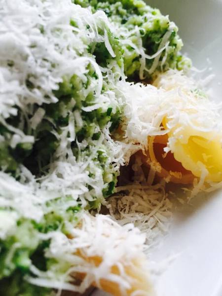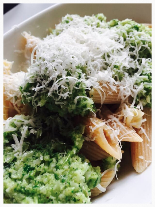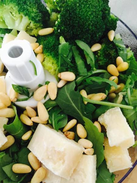 Püriert dann erstmal Knoblauch, Walnüsse, Parmesan & Ruccola mit einem Schuß Öl und gebt dann erst den Brokkoli dazu. Den püriert ihr dann nur noch leicht oder hebt ihn nur unter. Ansonsten wird das nämlich eher ein Püree/Brei als ein Pesto. Nach Geschmack ggf etwas würzen. Tadaaaaa: Pesto Marke selfmade :)