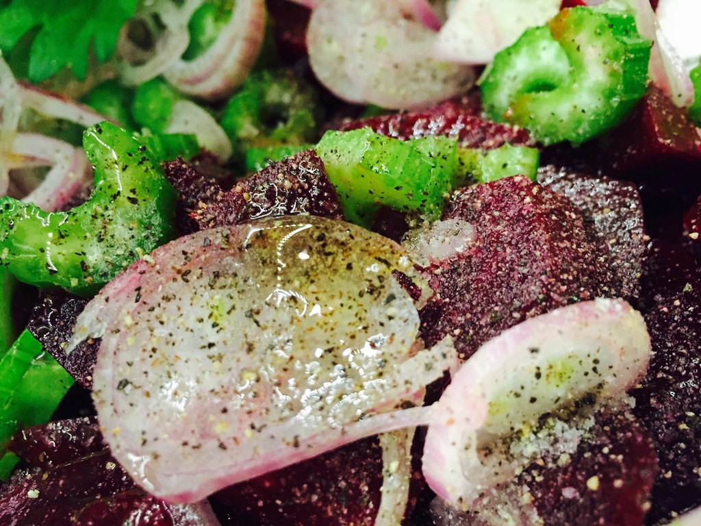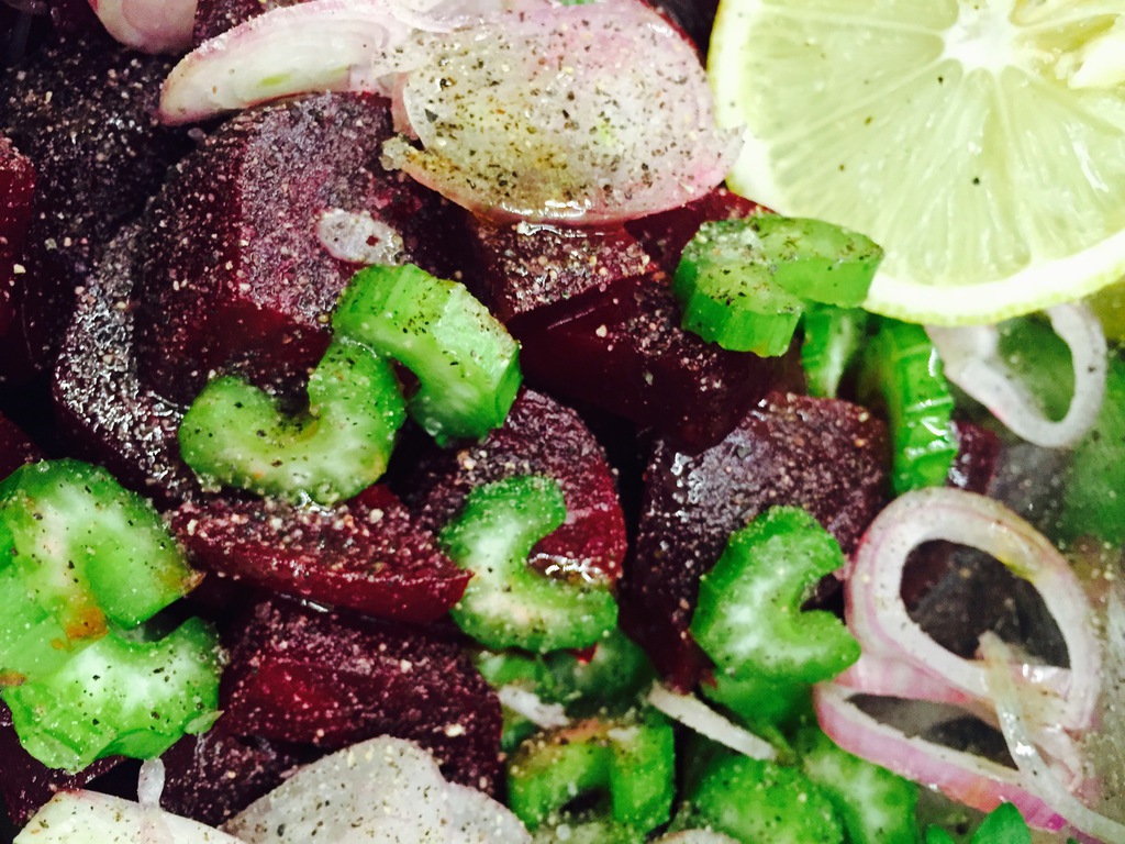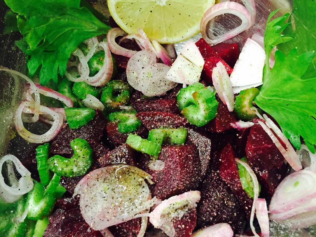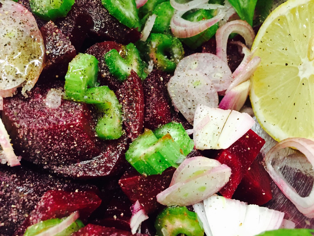 Würfelt den rote Beete und schneidet auch den Staudensellerie und die Charlotte in feine Streifen.
