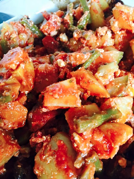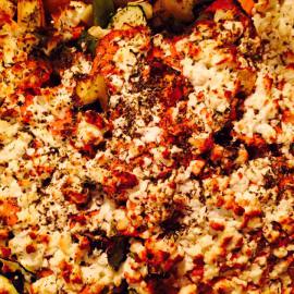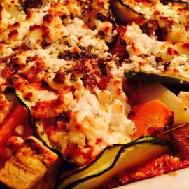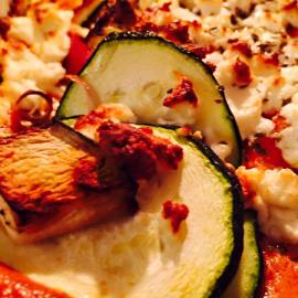 Anschließend gebt ihr die gestückelten Tomaten in eine Schüssel und vermischt diese mit einem der zwei Schjafskäse (wenn möglich mit Pürierstab, geht aber auch per Hand). Zudem gebt ihr 5-6 EL Olivenöl und eine gute Menge Oregano hinzu. Diese Soße hebt ihr jetzt in der Auflaufform unter das Gemüse.